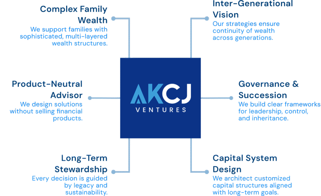 At AKCJ Ventures, we help families and enterprises navigate complexity across wealth, governance, strategy, and transition. Our multi disciplinary expertise brings clarity to decision-making, discipline to execution, and confidence at critical moment —enabling progress with purpose and precision.