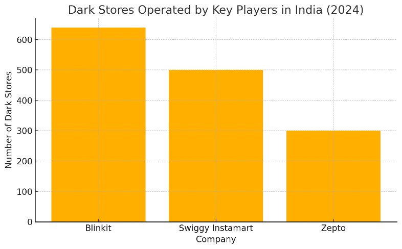 As of 2024, Blinkit operates over 640 dark stores, Swiggy Instamart operates over 500 dark stores across India, while Zepto manages over 300.