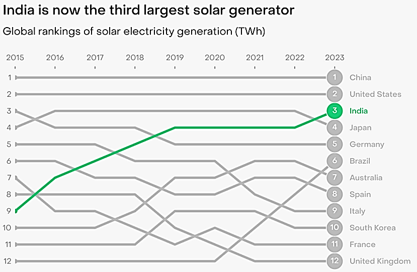As per the Global Electricity Review 2024, India surpassed Japan to claim the title of the world’s third-largest solar power generator in 2023 from 9th ranking in 2015.