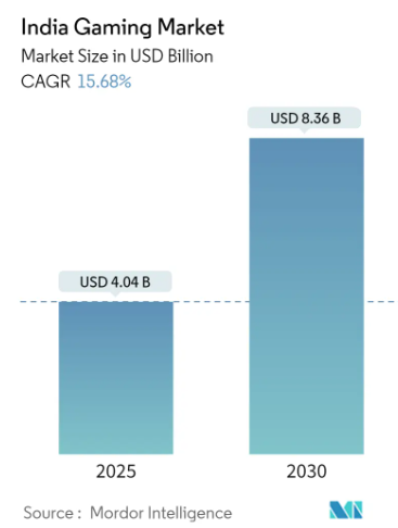 India’s gaming industry is undergoing a rapid transformation, driven by a tech-savvy population, widespread smartphone adoption, and increasing internet penetration. With an estimated market size of USD 4.04 billion in 2025, projected to reach USD 8.36 billion by 2030 at a CAGR of 15.68%, the sector is poised for exponential growth.